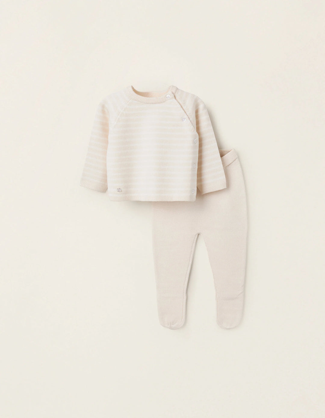 Conjunto de punto gris para recién nacido. Incluye un jersey a rayas con botones laterales; y unos pantalones con pies y cintura alta. Un conjunto suave y acogedor.