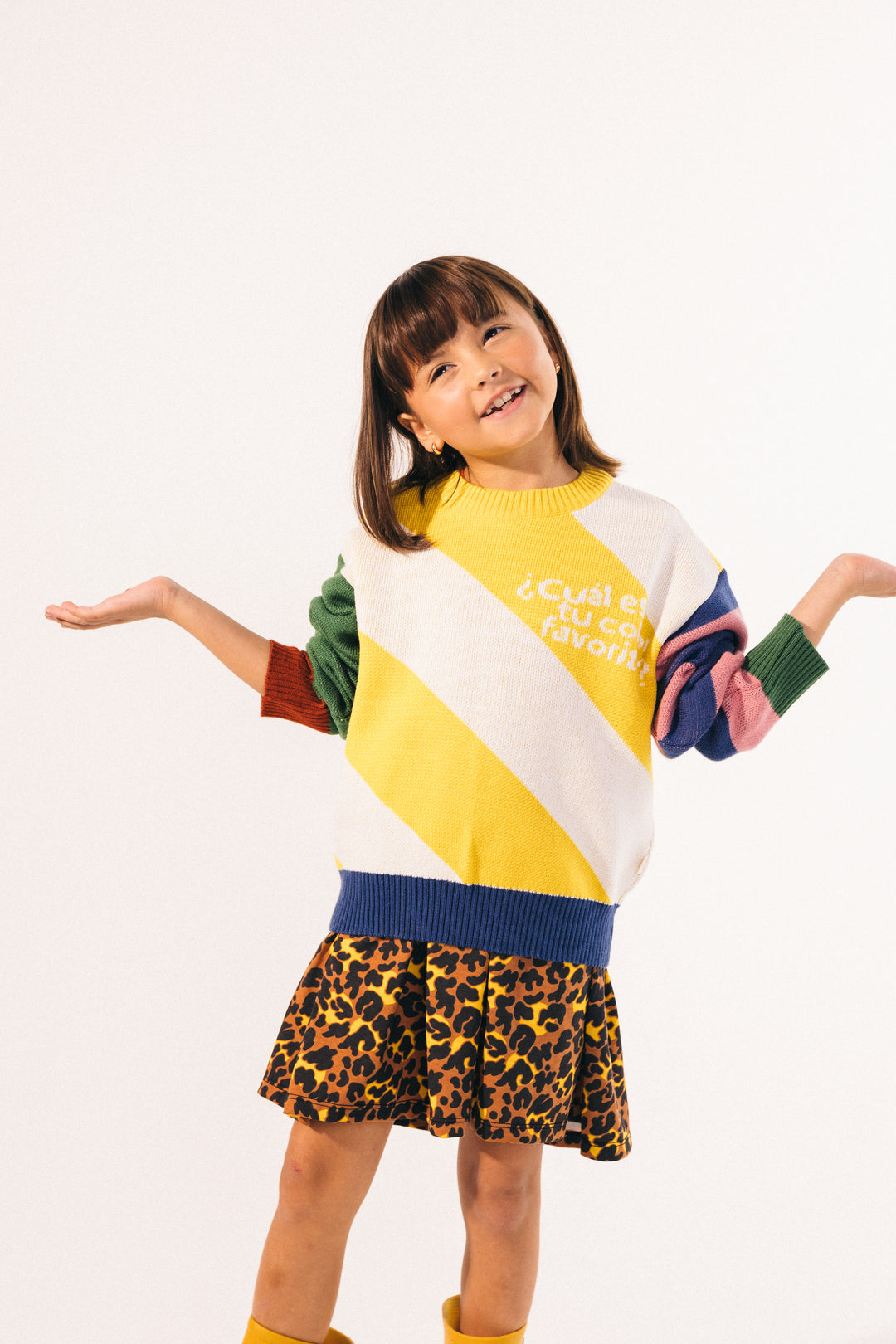 Buzo para niños, unisex, manga larga de cuello redondo. Tejido de rayas de colores perfecto para mantener a nuestros hijos muy abrigados y cómodos. Con texto en parte lateral frontal que dice: ¿Cuál es tu color favorito?