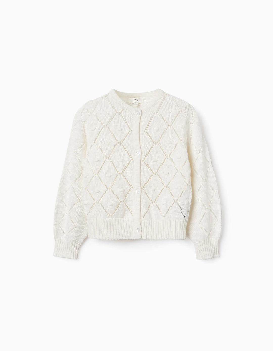 Chaqueta blanco de punto 100% algodón para niña. Efectos de punto en picotado y en relieve. Se abrocha por delante con botones. Extremos acanalados para un mejor ajuste y comodidad. Una chaqueta cómoda con punto suave.