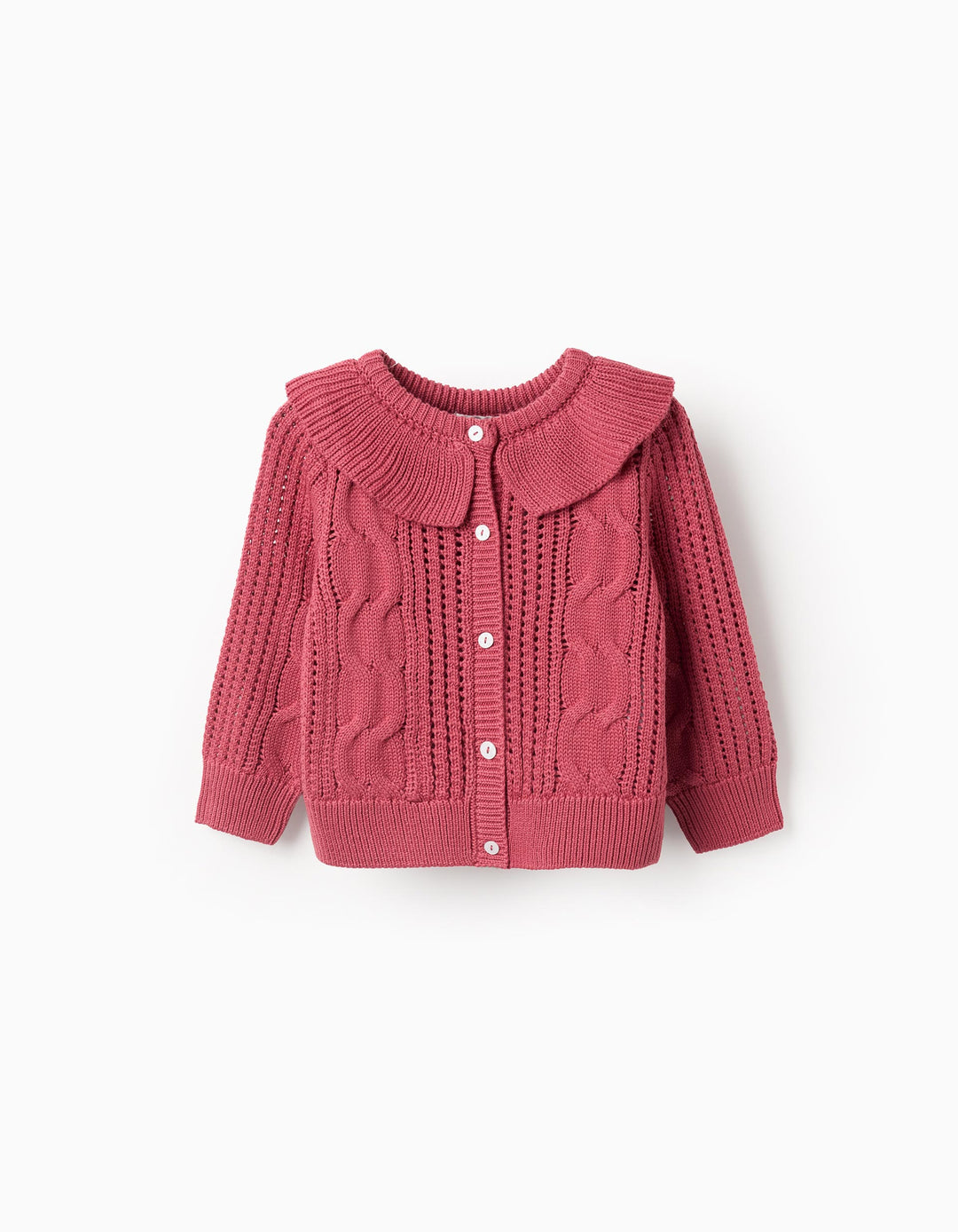Cárdigan de punto calado rosa para bebé niña, con detalles de punto trenzado y con cuello de volantes. Extremos acanalados para un ajuste perfecto. Botones de imitación de nácar. ¡Versátil e intemporal!